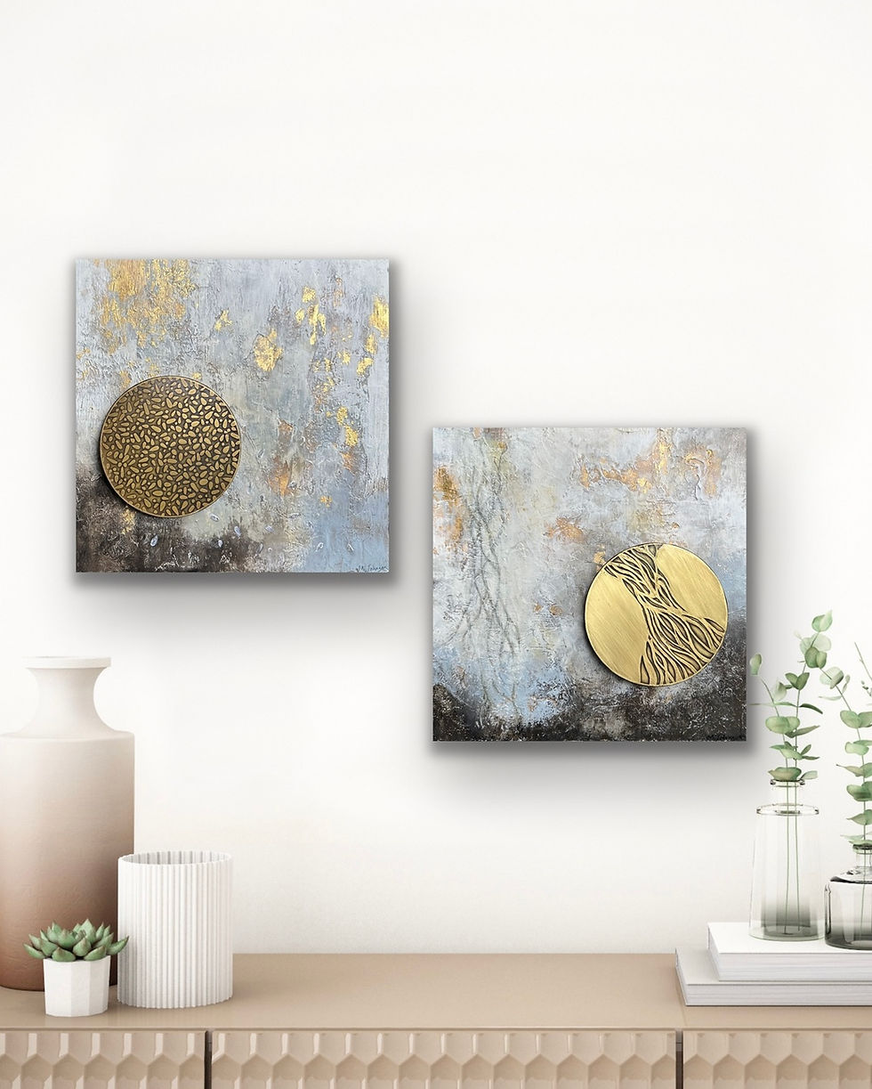 In this body of work, each piece features a hand-made turning disc—sometimes brass, sometimes painted or layered in mixed media—designed to be turned by hand. The act of turning becomes a symbol of participation: a reminder that peace is something we create through engagement, awareness, and intentional action. It asks us not to remain idle, but to be part of the movement toward connection and harmony.